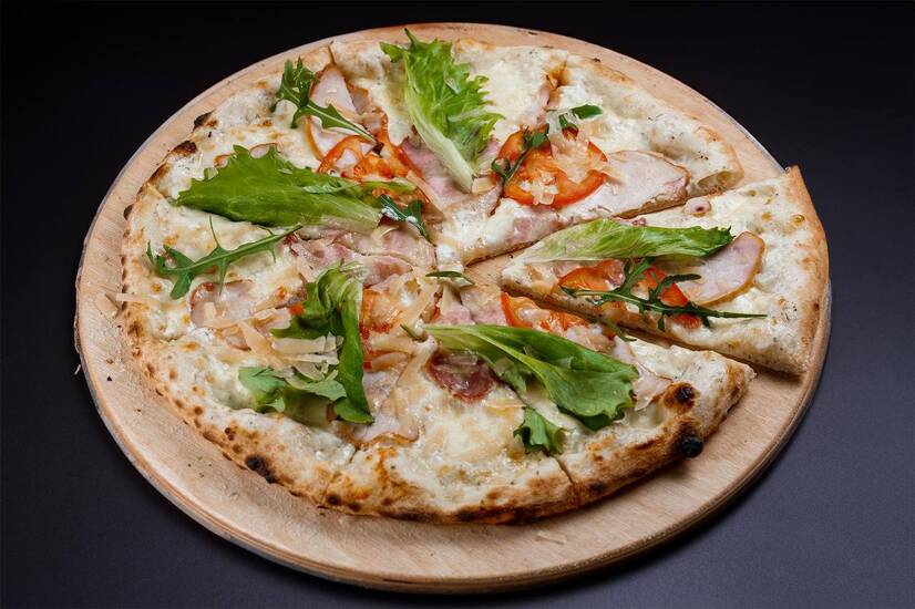 Соус цезар, сир моцарела, курка маринована, бекон, рукола, листя салату, томати свіжі, сир пармезан.