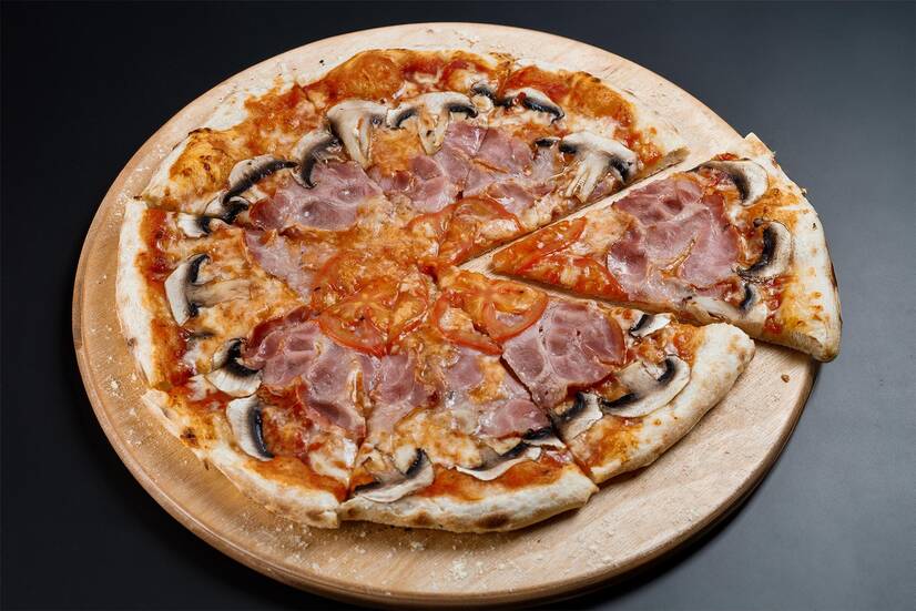 Соус томатний, сир моцарела, шинка польська, печериці, томати свіжі.