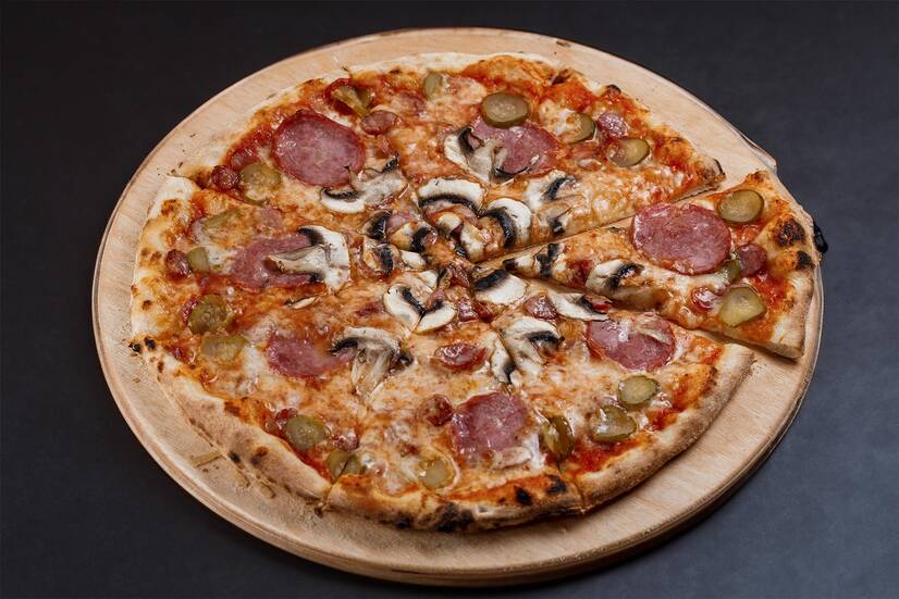 Соус томатний, сир моцарела, шинка, мисливські ковбаски, печериці, огірок маринований.